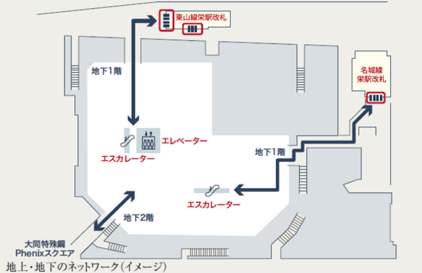 地下鉄「栄駅」と直結し、地下街からもバリアフリーでアクセスできることから、